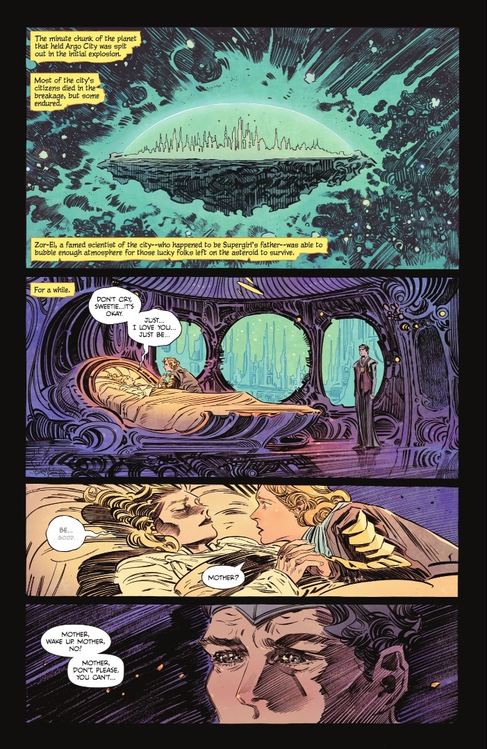 Unlike Clark, Kara grew up amongst Kryptonians, as her hometown of Argo City survived Krypton’s destruction. In the Woman of Tomorrow comic, however, we learn that her mother died soon after from radiation poisoning, the result of yellow sunlight changing the chemical composition of the rock beneath Argo City. Eventually, asteroids pierce the city’s protective shield, prompting Kara’s father to send her into space in a rocket like Clark’s. We witness Argo City’s destruction in the trailer, and what appears to be a Kryptonian funeral procession in which Kara marches. As Ruthye says in the comic—and Kara echoes in the trailer—“Krypton did not die in a day. The gods are not that kind.”