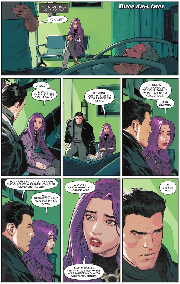 Despite all this drama, Bruce ended things with Scarlett on good terms. And he doesn’t appear to be too soured on love, because if you read the recent Batman #4, then you know that Bruce is going on a date with Annika Zeller, a doctor who works at Arkham Tower. Of course, Batman is also investigating her to see if she’s experimenting on Arkham patients, so it’s possible this one may not end all that differently.